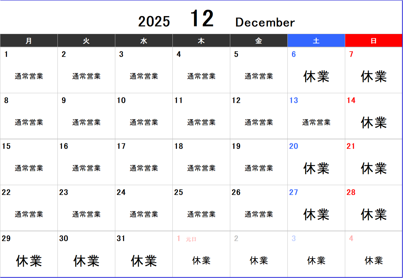 年末・年始の休業日は 2025年12月27日(土)~2026年1月4日(日) までとなっております。